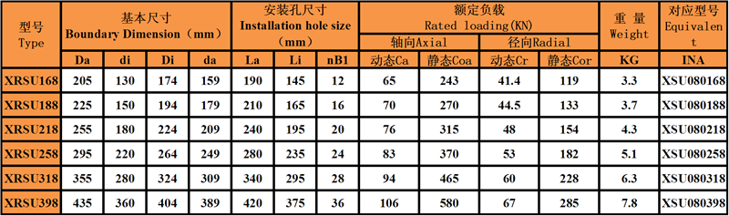 洛陽普瑞森XRSU系列(內(nèi)外環(huán)體型、帶安裝孔、高剛性)交叉滾子軸承可替代INA公司XSU08系列,普瑞森XRSU系列高剛性交叉滾子軸承由于內(nèi)外環(huán)都采用整體結(jié)構(gòu),具有高剛性,并且?guī)в邪惭b孔,安裝時(shí)不需要固定法蘭和軸承座,很大程度簡化安裝程序,并且不影響安裝精度,具有較高的旋轉(zhuǎn)精度和較大的扭矩,同時(shí)也可以根據(jù)精度要求自由選擇內(nèi)圈或者外圈旋轉(zhuǎn)的方式,具有較大的選擇自由度。它與XRU的區(qū)別是密封結(jié)構(gòu)采用雙面彈簧簧片式密封,并且外形尺寸比XRU系列更緊湊,更適合于安裝空間較小的安裝位置。