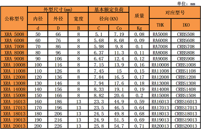 洛陽(yáng)普瑞森XRA系列超薄型交叉滾子軸承可替代THK公司RA、RA-C系列;IKO公司CRBS系列交叉滾子軸承,XRA系列交叉滾子軸承是把內(nèi)圈和外圈的壁厚做得非常薄的圓柱交叉滾子軸承,占用空間小并且能承受較重的載荷,非常適用于機(jī)器人或者工業(yè)機(jī)械手的手部旋轉(zhuǎn)關(guān)節(jié)部位。外圈是2分割的結(jié)構(gòu),通過(guò)鉚釘固定后成為體。